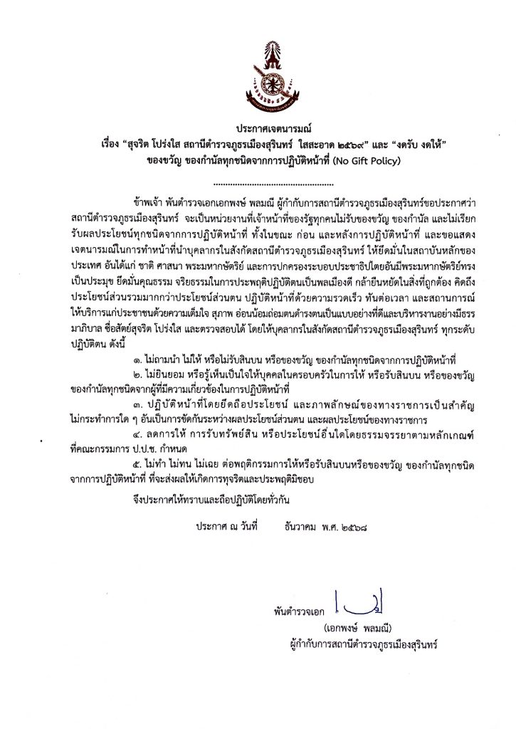 สภ.เมืองสุรินทร์วันที่ 29 พฤษภาคม 2568 เวลาประมาณ 11.00 น. พ.ต.อ.เอกพงษ์ พลมณี ผกก. สภ.เมืองสุรินทร์
