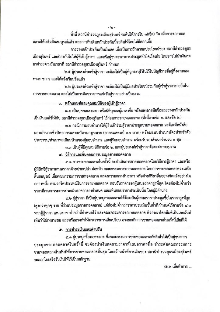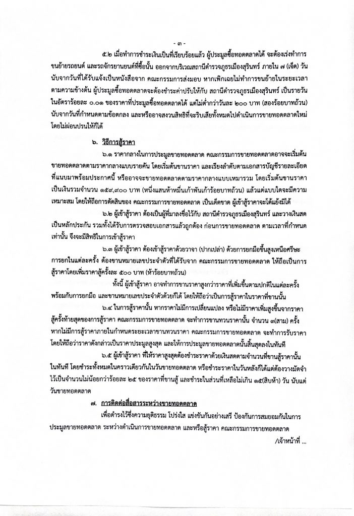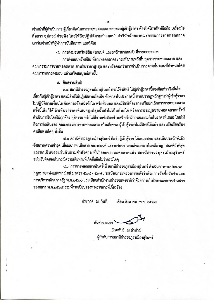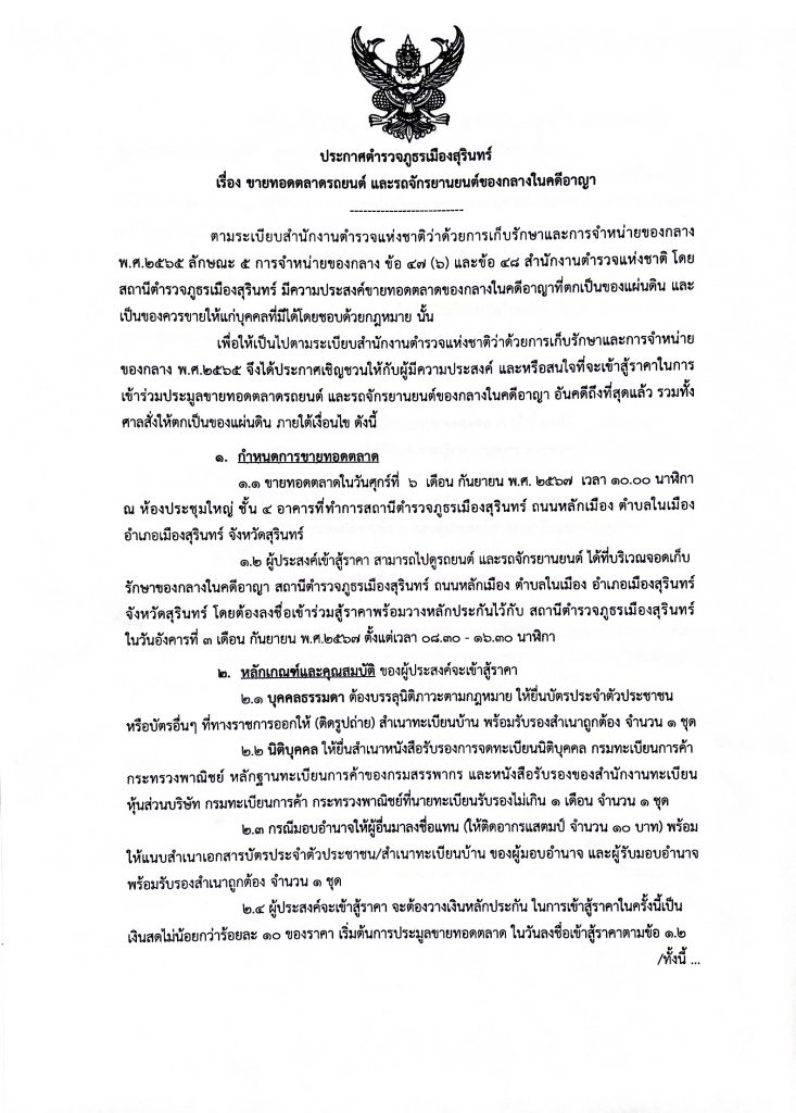 ประกาศสถานีตำรวจภูธรเมืองสุรินทร์ เรื่อง ขายทอดตลาดรถยนต์ และรถจักรยานยนต์ของกลางในคดีอาญา 30 สิงหาคม 2024 โดย muang surin / ไม่มีหมวดหมู่