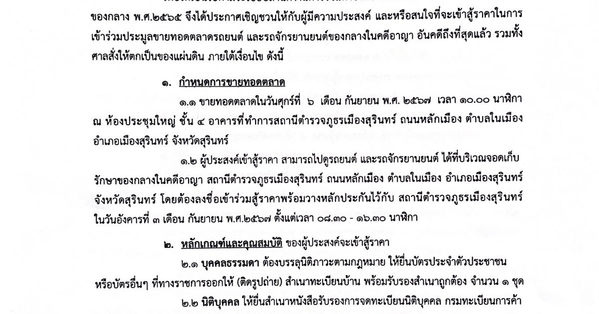 ประกาศสถานีตำรวจภูธรเมืองสุรินทร์ เรื่อง ขายทอดตลาดรถยนต์ และรถจักรยานยนต์ของกลางในคดีอาญา