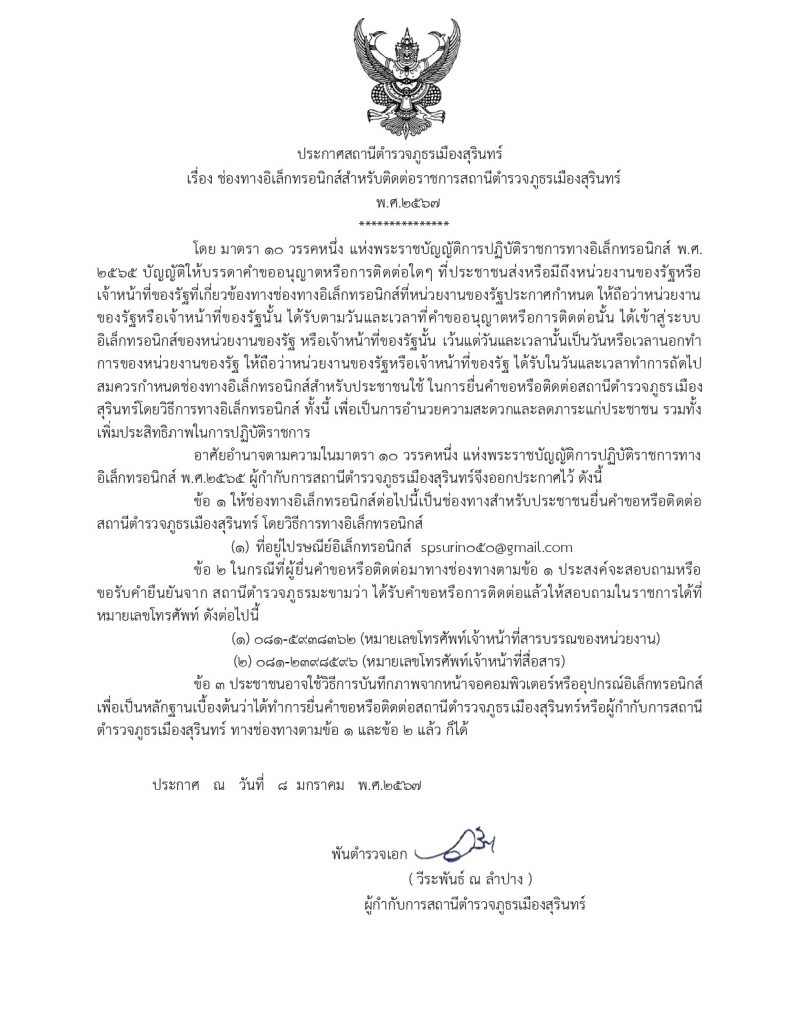 ประกาศสถานีตำรวจภูธรเมืองสุรินทร์ 6 มิถุนายน 2024 โดย muang surin / ข่าวประชาสัมพันธ์ เรื่อง ช่องทางอิเล็กทรอนิกส์สำหรับติดต่อราชการสถานีตำรวจภูธรเมืองสุรินทร์ พ.ศ.2567