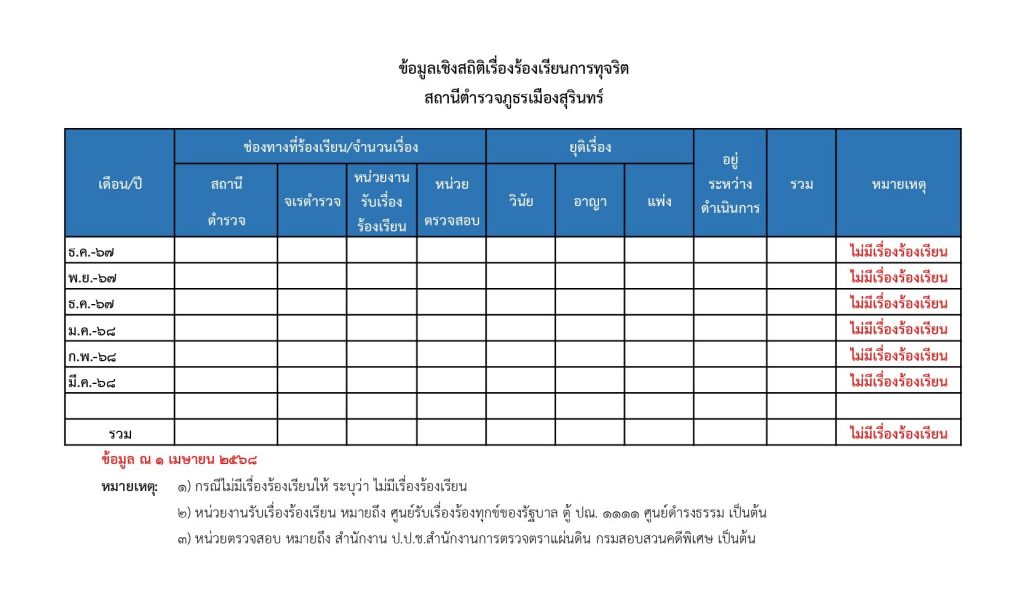 ข้อมูลเชิงสถิติเรื่องร้องเรียนการทุจริตสถานีตำรวจภูธรเมืองสุรินทร์